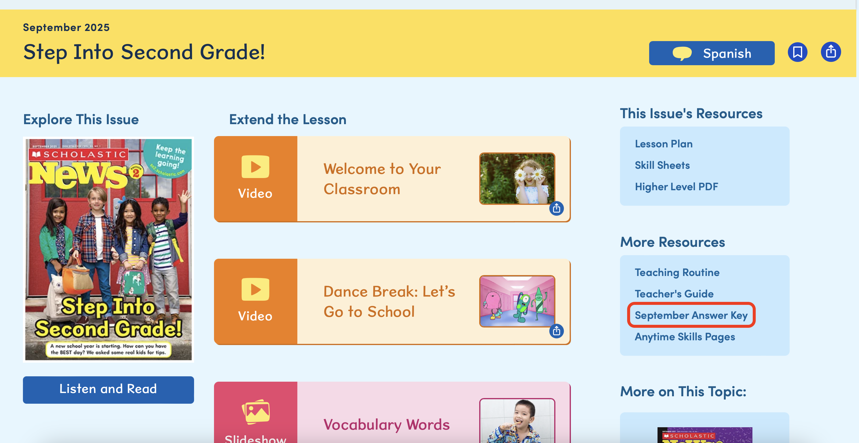 To find each month's Answer Key, click “Answer Key” under More Resources on the right side of a given month's issue page. This will bring you to a pdf with answers for page 4 activities and Skill Sheets.